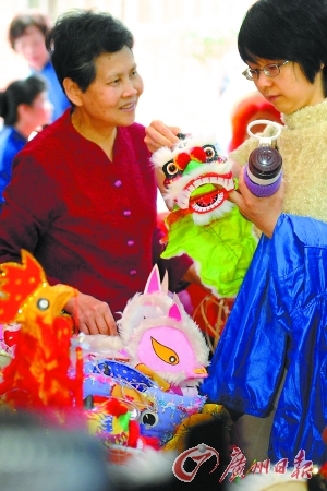 市民与彩灯制作艺人陆燕红(左)交流。广州日报记者莫伟浓 摄