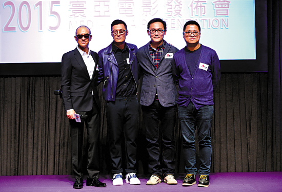 张家辉(左)、余文乐(左二)随两位导演亮相