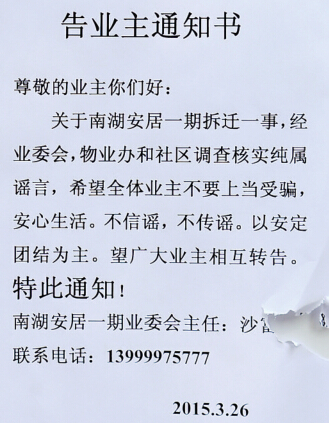 “26号上午我接到居民电话,询问拆迁一事,我还纳闷呢,这事我怎么不知道。”南湖安居一期业主委员会主任沙富生说,随后他看了通知,并联系了物业、社区进行了核实,“那则通告是有人假冒拆迁办贴上的,随后我贴上了辟谣通知。”