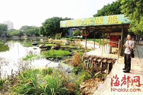 此外,在公园西门右侧的“激光水战船”游乐场,售票处已被关闭,临近的湖面上漂浮着数艘游船,岸边同样是杂草丛生,一片萧条。此前,本报曾经报道,在左海公园海底世界旁的游船码头,就有大量游船废弃。