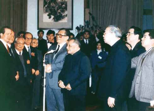 1990年2月,邓小平与江泽民等同志会见出席中华人民共和国香港特别行政区基本法起草委员会第九次全体会议的委员。为了解决香港、澳门、台湾的问题,实现祖国统一,邓小平同志创造性地提出了“一个国家,两种制度”的伟大构想。