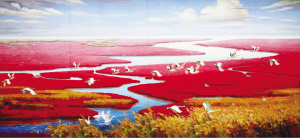 “为了这幅画,我们创作者反复前往红海滩进行考察,既不能让画面流于照片化,还要体现出辽宁白山黑水的自然景观的壮美,对我自己也是一次挑战。”高阳说。红海滩位于我省盘锦市的辽河三角洲内,是大自然恩赐与这片土地的又一奇观。它以绵延千里的红色碱蓬草闻名于世,现在也是辽宁省的旅游度假地。