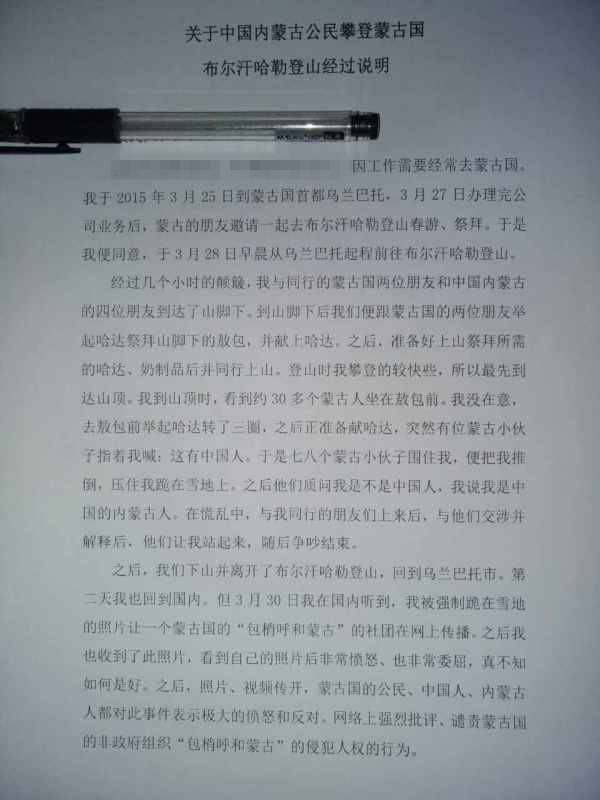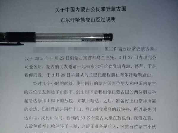 事件中的中国游客在向新华社记者提供一份书面说明中说,他由于工作需要经常去蒙古国。事发当天,他和几名中国朋友和蒙古国朋友前往不儿罕山登山春游、祭拜。这名游客在同行的人中最早登上山顶,当时有大约30名蒙古国人坐在敖包前。