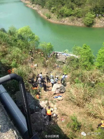 原标题:浙江一辆载17人客车坠崖 伤者送往医院(图)