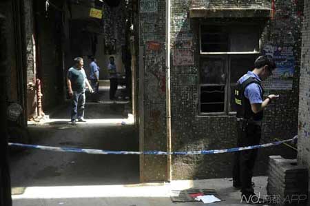 警察在事发现场取证。据多位街坊证实,该楼房东称该求救女子被同居男子用刀捅至身亡。据住在该楼4楼的张先生称,该案的两个男女均为二三十岁,搬进该楼不久,出双入对。目前,现场仍有民警进出,男子和女子的遗体已被殡葬车拉走。