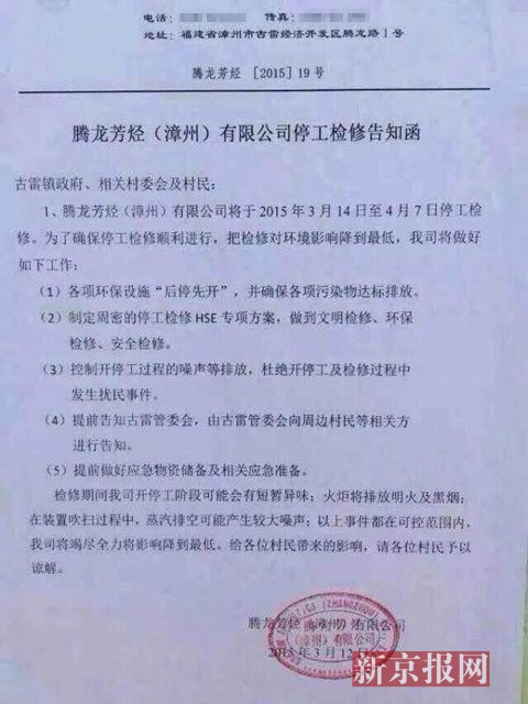 知情人提供了一份名为《腾龙芳烃(漳州)有限公司停工检修告知函》的文件,文件发布日期为3月12日,并盖有该公司的印章。这则告知函是发给“古雷镇政府及相关村委会及村民”,称该公司将于3月14日至4月7日停工检修。