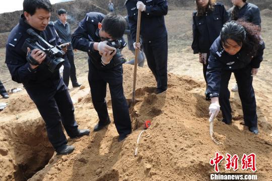山西忻州警方破获一起特大持枪入室抢劫强奸杀人案。两名受害者被犯罪团伙活埋于墓穴死亡,其中一名同伙因分赃不均被枪杀,目前其他犯罪嫌疑人已悉数落网。图为警方在挖开墓地找到被绑架夫妇的尸体。 警方供图 摄
