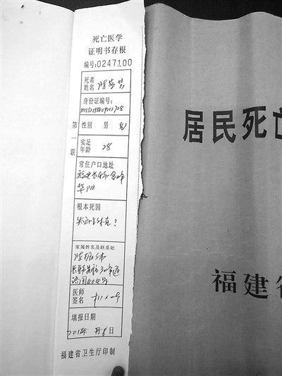 北青报记者调查发现,长乐市医院“居民死亡医学证明书”里,陈的死亡证明不仅有前后两份(前者已标注为“作废”),后一张更现“鸳鸯联”情形——即医院存根和拿给家属的有别,相差一个问号!
