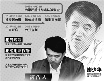 陕西省西安市中级人民法院9日公开宣判贵州省委原常委、遵义市委原书记廖少华受贿、滥用职权案,认定被告人廖少华犯受贿罪,判处有期徒刑15年,并处没收财产人民币130万元;犯滥用职权罪,判处有期徒刑2年,决定执行有期徒刑16年,并处没收财产人民币130万元。