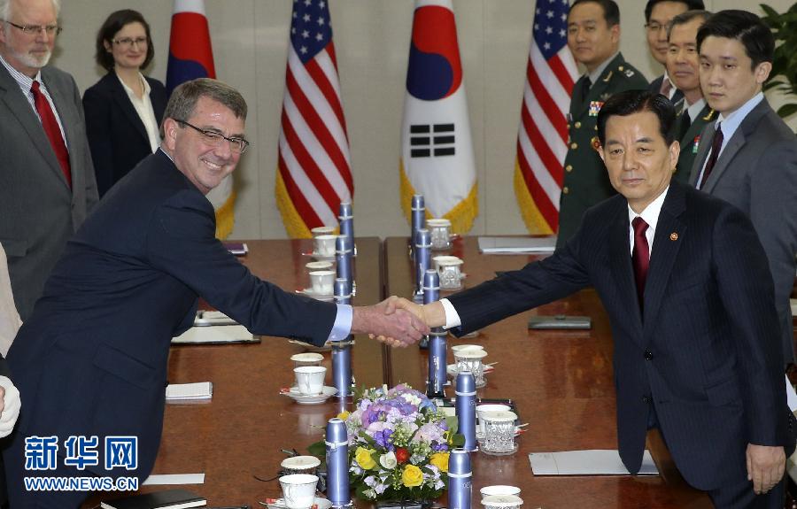 4月10日,在韩国首尔,韩国国防部长官韩民求(前右)与美国国防部长阿什顿·卡特(前左)在会谈中握手。(资料图)