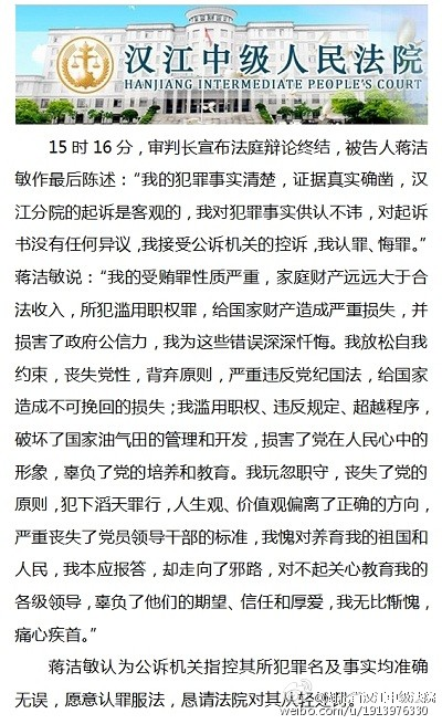 蒋洁敏受审最后陈述:犯下滔天罪行 走向了邪路