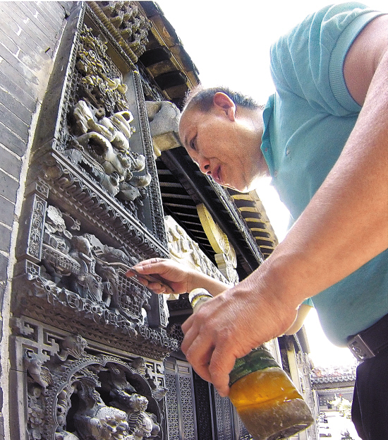 李继光告诉记者,这些砖雕都是先雕刻好再用桐油灰和竹钉固定在墙上的,为了“修旧如旧”,李继光沿用桐油灰进行砖雕修补,“竹钉要先泡桐油,进行防腐处理,桐油灰能凝固缝隙,黏住砖雕,这能使砖雕寿命延长100年。”