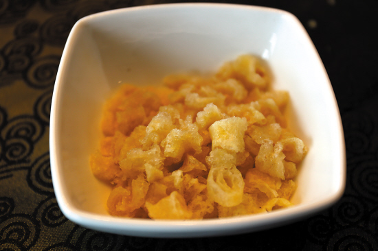 在80多年前,“冠珍包办馆”就有清汤炸肚这道名菜,主要是因为其炸鱼肚的方式十分特别。那里的师傅采用铁罉作为煮油的炊具,只放罉的一半这么多油。将鱼肚放入油锅后,先用铁饼压压鱼肚,令其沉底,在受热受压的条件下涨发到透。同时,用荔枝树枝作为燃料,鱼肚放下后便立刻收火,利用炭火的余热持续浸炸鱼肚直到其通透松化。这样炸成的鱼肚,绝对是通体膨胀,异常洁白,最重要的是入口爽滑而软,堪称一绝。