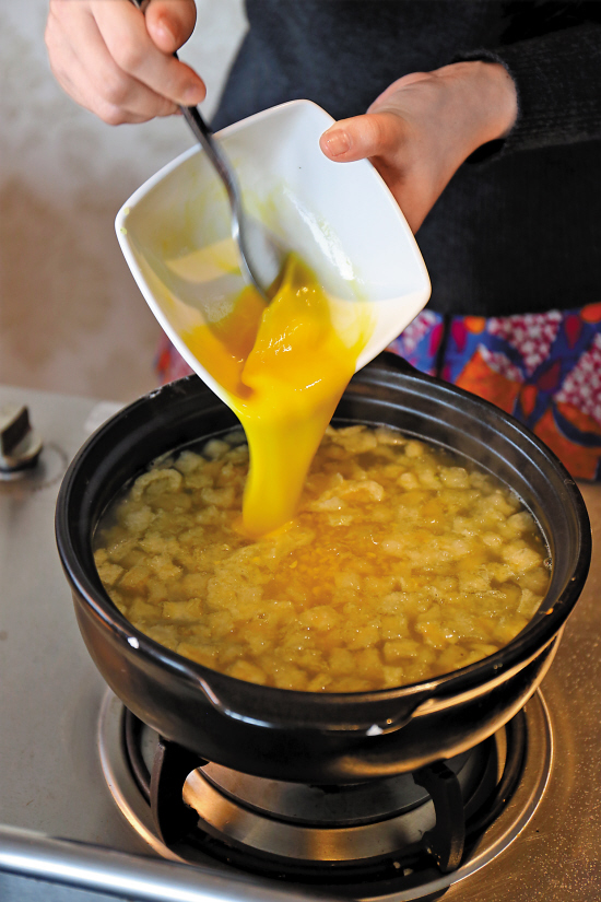 5.最后把鸡蛋打开后倒入汤中快手搅拌即成