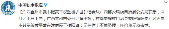 人民网北京4月21日电 据新华社对外部微博消息,记者从广西都安瑶族自治县公安局获悉,4月21日上午,广西宜州市委书记黄平权,在都安瑶族自治县安阳镇阳安社区古岸屯其堂弟黄平营在建房屋三楼阳台(无护栏)不慎坠楼,经抢救无效去世。