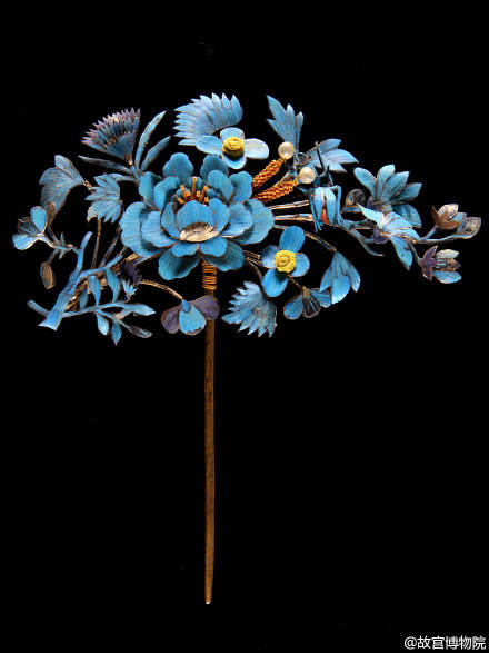简直美瞎了三酱的眼。不过美则美矣,制作过程则让三酱揪心。点翠所需的羽毛必须由活的翠鸟身上拔取,才可保证颜色之鲜艳华丽。硬翠一般取翠鸟左右翅膀上各十根(行话称“大条”)、尾部羽毛八根(行话称“尾条”),所以一只翠鸟身上一般只采用大约二十八根羽毛,病死的翠鸟其羽毛一般还不能制作好的首饰。刘阿姨那样的头面要用到80只翠鸟。而据刘阿姨讲,“梅兰芳先生的点翠是颜色绝对相同的软翠,一头大概需要几百只翠鸟”。古时云南等地每年都要向宫廷朝贡几百对翠鸟,用此羽毛来制作宫中所需的各种头饰、风景挂屏、盆景花叶等点缀之物。