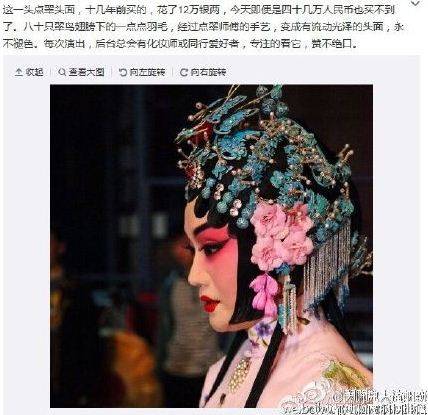 顾影自盼换来了佛头着粪,刘阿姨真替自己冤得慌。今天凌晨,刘阿姨报复式地连发 9张点翠头面图回击网友,以证明行业内就是这样干的:“80只翠鸟一头点翠头面,720只翠鸟换来九位艺术家光彩头目的头面,今天几十万一头价格不菲,各大院团为了民族艺术投资大手笔!”