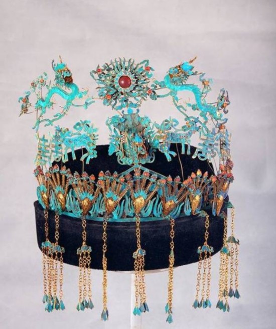 (清代的一顶点翠二龙九凤六蝶凤冠(上),清代点翠双凤鹿花卉纹勒子(下))