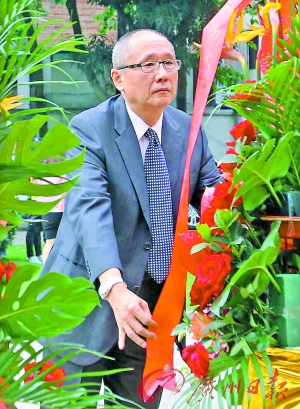 廖淳向廖仲恺像献花篮。广州日报记者王维宣摄