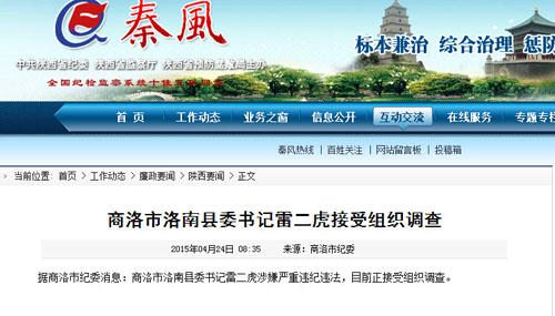 陕西洛南县委书记雷二虎涉严重违纪违法接受组织调查