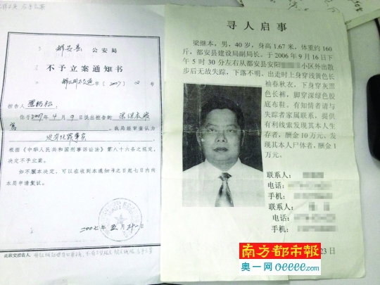 死者家属当年贴出的寻人启事,以及警方给出的不予立案通知书。