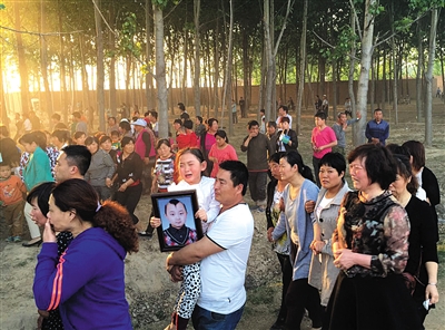 昨日下午,河北省大名县,邓鸣贺的家人抱着妹妹,妹妹抱着鸣贺的照片,戏迷与乡亲排着长队,一起为小鸣贺送行。网友供图
