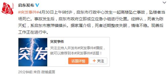 人民网北京4月30日电 据江苏启东市委宣传部官方微博消息,4月30日上午9时许,启东市行政中心发生一起高楼坠亡事故,坠楼者当场死亡。事故发生后,启东市政府立即成立应急小组进行处置。经辨认,死者为陈天虹,系启东市惠萍镇镇长。