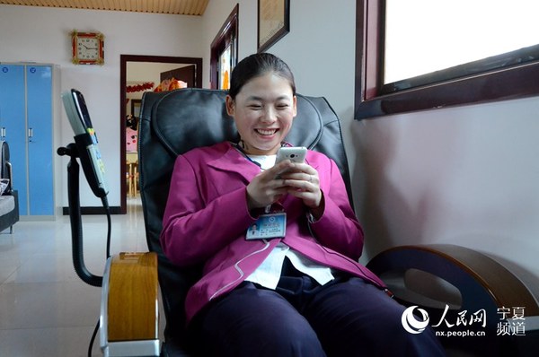 由于每天站立的时间太长,王淑伟一趟讲解下来就会腰酸背痛,近段时间还出现了静脉曲张的症状。在下一趟讲解之前,王淑伟抓紧时间坐在按摩椅上按摩。景区离市区比较远,和同龄人丰富的娱乐生活相比,王淑伟没有出去游玩的条件,玩手机成了她唯一的娱乐时间。人民网 阎梦婕摄