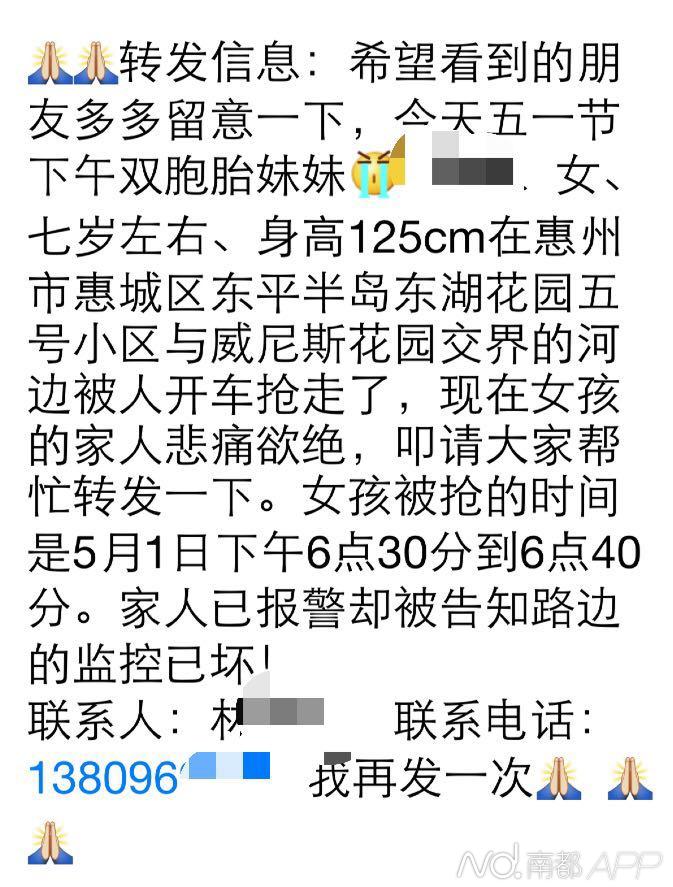 疑似女童母亲发布的相关微信显示:女孩7岁,身高125厘米,昨日下午6点35分前后,在惠城区东平半岛东湖花园五号小区,与威尼斯花园交界的河边被人开车抢走。女孩母亲在信息末留下自己的姓名和电话。