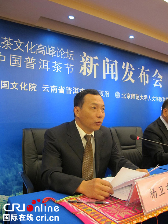 普洱市政府副市长、茶节组委会执行主任杨卫东介绍茶节情况(汪鑫 摄)