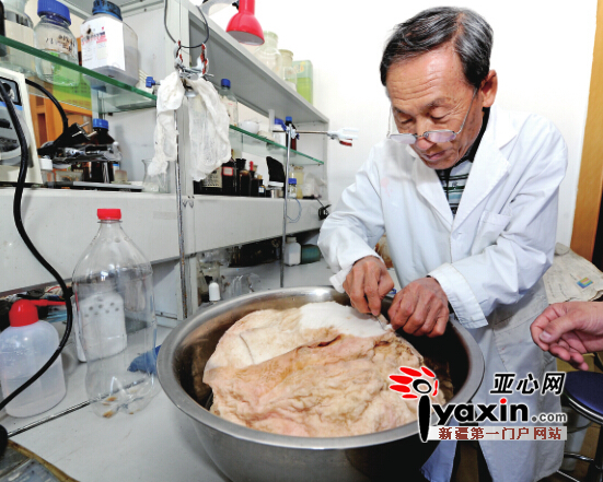 昨日,新疆农科院微生物研究所研究员徐长伦对“太岁”取样检测。亚心网首席记者 张万德 摄