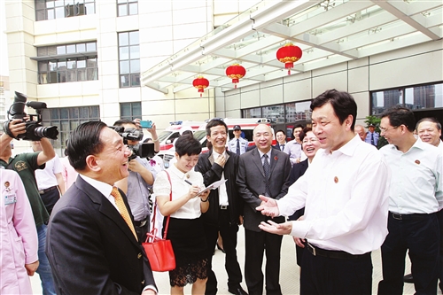 省委常委、福州市委书记杨岳(右三)昨日到省立金山医院调研,听说海都记者反映医院缺少大树,现场协调帮忙