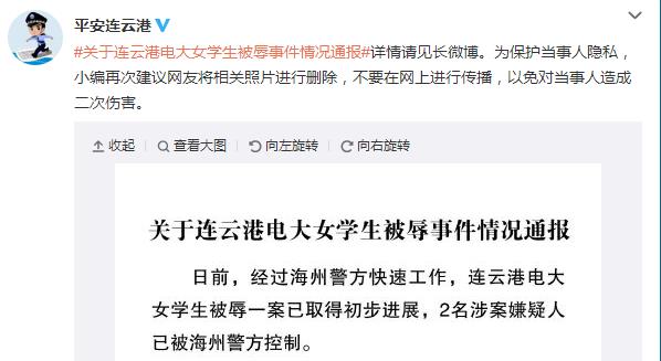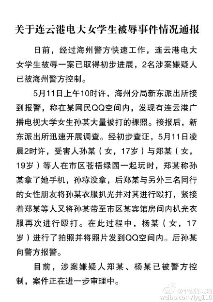 人民网北京5月11日电 江苏连云港市公安局官方微博今日晚间发文对“连云港电大女学生被辱”事件情况进行通报。据悉,经过海州警方快速工作,连云港电大女学生被辱一案已取得初步进展,2名涉案嫌疑人已被海州警方控制。