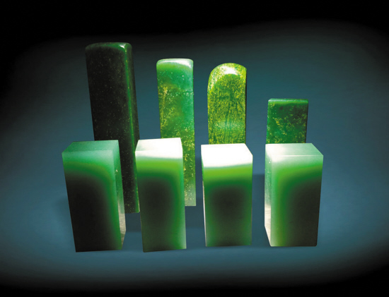 陈金城:上世纪80—90年代,福建青田的人会拿其他带有绿色的石料来充当广绿玉,因为印章很贵,80年代一方章就要几千块钱。总体而言,拿其他石冒充广绿玉的现象还是比较少的,不足以冲击市场。了解广绿玉的人应该也是能鉴别出真假的。