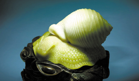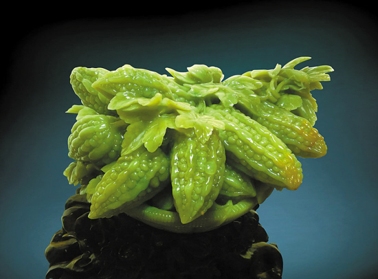 陈金城:这15年广绿玉的的确确已经上了一个台阶。广绿玉的颜色丰富,所以设计也就比较多样,昆虫、蔬果等可以用巧色,这是广绿玉最大的特点。在技艺上可以说达到了青田石雕、寿山石雕的水平,但广绿玉怎么走出这个圈圈,如何形成自己的风格和特点,是第三阶段发展的方向。