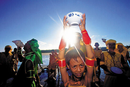 舞人龙之前要先祭海。吹响海螺,再来一碗辣酒。