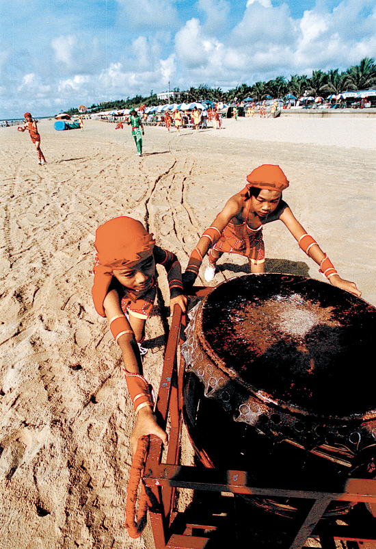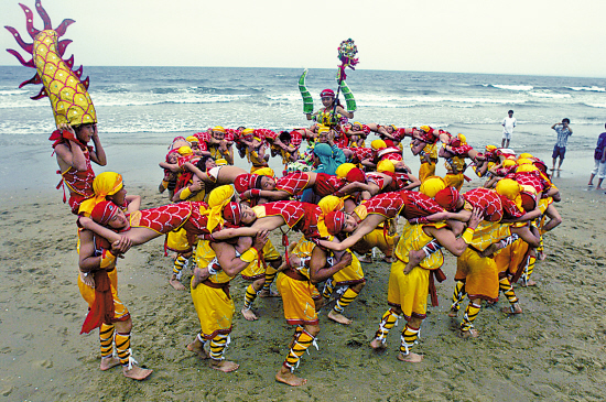 80多人甚至100多人组成一条蛟龙,在纯蓝的海天和金色的沙滩上舞动。那龙先是微摆,继而狂走,然后旁冲,扭成一圈,终于又慢慢展开……这条“龙”已被录入《中国民族民间舞蹈集成》(广东卷),2006年入选首批国家非物质文化遗产名录,曾拿过全国民间艺术最高奖项山花奖。它便是广东地区特有的“东海人龙舞”。2007年时,由188位农民和学生集体出演的人龙舞在东海岛龙海天沙滩上亮相,还成功载入“上海大世界基尼斯”之最,获得“中国最长人龙舞”认证(长达76米)。