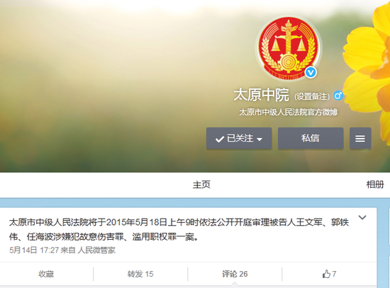 中新网5月18日电 据太原市中级人民法院官方微博“太原中院”消息,备受关注的山西太原“农妇讨薪死亡案”3名涉案警方人员今日将在太原中院受审,法院发布的公告显示,3名被告人涉嫌犯故意伤害罪、滥用职权罪。