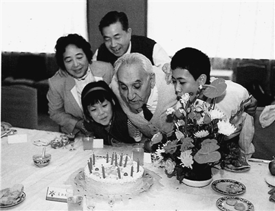 马海德同志生前与苏菲及家人一起庆祝生日。