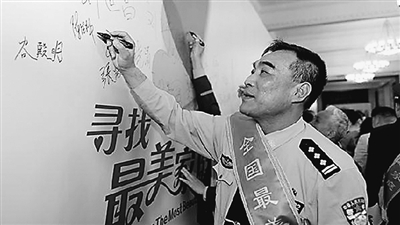 全国“最美家庭”入选者在揭晓仪式的签名板上签名。