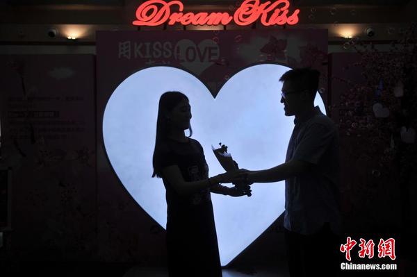 5月19日,重庆一商场举行接吻大赛,不少情侣站在桃心前晒出各自不同的吻姿,同时对自己的爱人进行甜蜜表白。中新社发 陈超摄