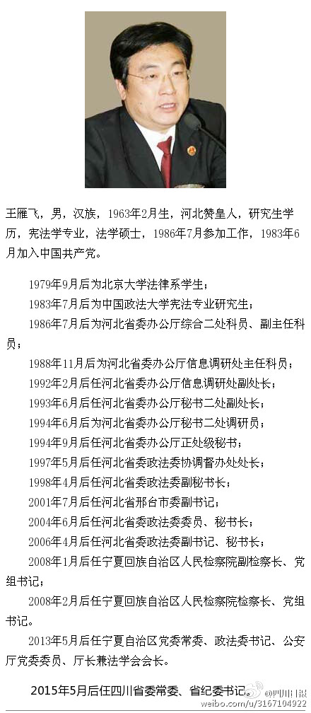 王雁飞仼四川省委常委、省纪委书记(图/简历)