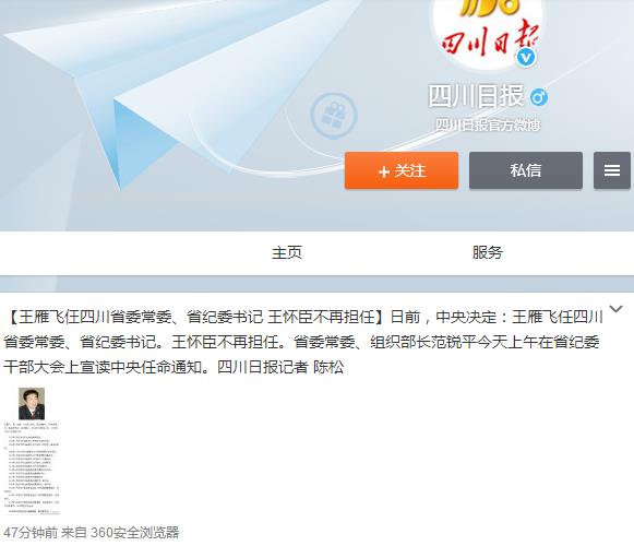 人民网北京5月20日电 据四川日报官方微博消息,日前,中央决定:王雁飞任四川省委常委、省纪委书记。王怀臣不再担任。省委常委、组织部长范锐平今天上午在省纪委干部大会上宣读中央任命通知。