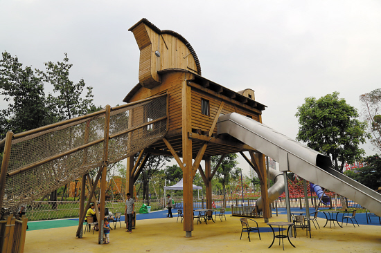 亮点:公园以“生态、低碳”为主题,分为核心区和外围区两部分。核心区主要包括入口广场、农耕园科普区、儿童活动区三部分;外围区主要保留了原橄榄公园的自然生态环境,种植有橄榄树、杨桃树、荔枝树等大量果树。公园中的农耕园科普区,种植了各种蔬菜,让小朋友们了解与生活密切相关的植物知识。公园内还有海盗船区、山体滑梯区、幼童游乐区、趣味秋千区、丛林探索区、林间攀爬区、沙池攀爬区、科普体验区、欢乐童真区和攀岩挑战区等十大游乐区。