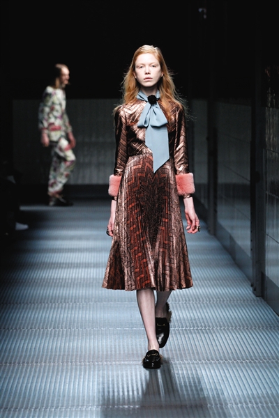 日前,全智贤亮相戛纳电影节的一袭长裙颇具话题性,其实这是Gucci 2015秋冬系列一套裙装的变奏版,材质、颜色都一样。这一季,品牌设计师Alessandro Michele在意想不到的地方加入褶裥——裤边以上几英寸,夹克单侧下摆,或是遍布蓝色泡泡纱连衣裙的全身。![]()