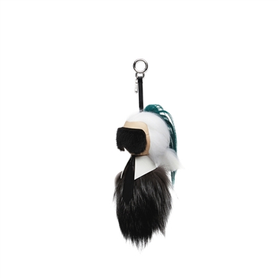 FENDI秀场上的一只小公仔Karlito引人注目,打扮成设计师Karl Lagerfeld的经典造型——头戴黑色水貂制成的墨镜,系着黑色小羊皮制成的领带,身穿白色衬衫,披着银狐外衣。经过FENDI天马行空的想象编织,将皮草、牛仔及运动装结合,趣味十足。(该系列在北京SKP四层有售)