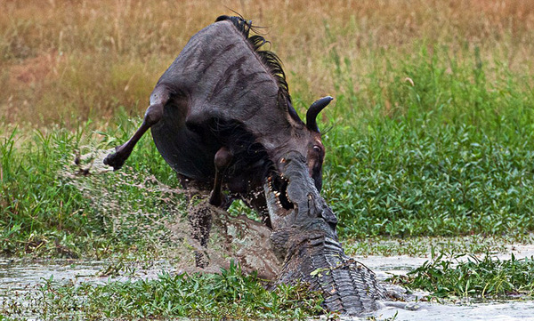2015年5月21日报道(具体拍摄日期不详),南非萨比桑顿(Sabi Sands)动物保护区内,一头雌性牛羚走到河边喝水,不料被一条饥饿的鳄鱼盯上,经过一番搏斗,这头牛羚被拖入水中。当这条鳄鱼满心欢喜,以为大餐到手时,旁边突然杀出一头河马,开始与它争抢牛羚。最后,鳄鱼赢得了这场争夺,得以独享美食。 (网站截图)