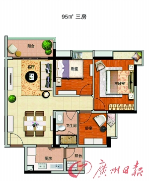该户型为三个卧室呈“品”字形分布,基本无浪费空间。客厅厅出阳台,保证通风采光。厨房还连通工作阳台,让小三房也有足够的晾晒空间。值得留意的是,3个卧室都有宽敞的飘窗台,其中主人房飘窗台还为270度设计,引景入室。![]()