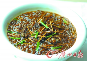 沙蒜非“蒜”,它原是沙虫的表兄弟。栖息在海土下吞食泥沙,从中吸取营养物质,故全身满是泥沙,呈青黄色,外形像蒜头,沙蒜之名大约就是这么来的。它虽然其貌不扬,却是味道鲜美,营养丰富,是补肾佳品。炳胜公馆师傅先以优质沙蒜熬制出浓汤,再加入嫩滑的绿豆面煨之,使之吸收浓汤中的精华,后加入适量十年陈酿花雕酒点缀,香气扑鼻,浓郁的鲜香味充盈了整个口腔。