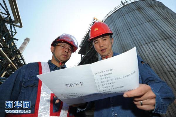 5月23日,中国石油吉林石化公司炼油厂硫磺一车间党支部书记张柏林(右)为工艺五班班长关洪海讲解“党员手卡”中的内容。中国石油吉林石化公司炼油厂2011年曾亏损47.86亿元,近年来,通过科学管理全员挖潜一举甩掉亏损“帽子”,2015年4月实现利润超过亿元。精细管理创效益,技改升级占市场,关爱员工暖人心,是企业华丽蜕变的关键。 新华社记者 张楠 摄
